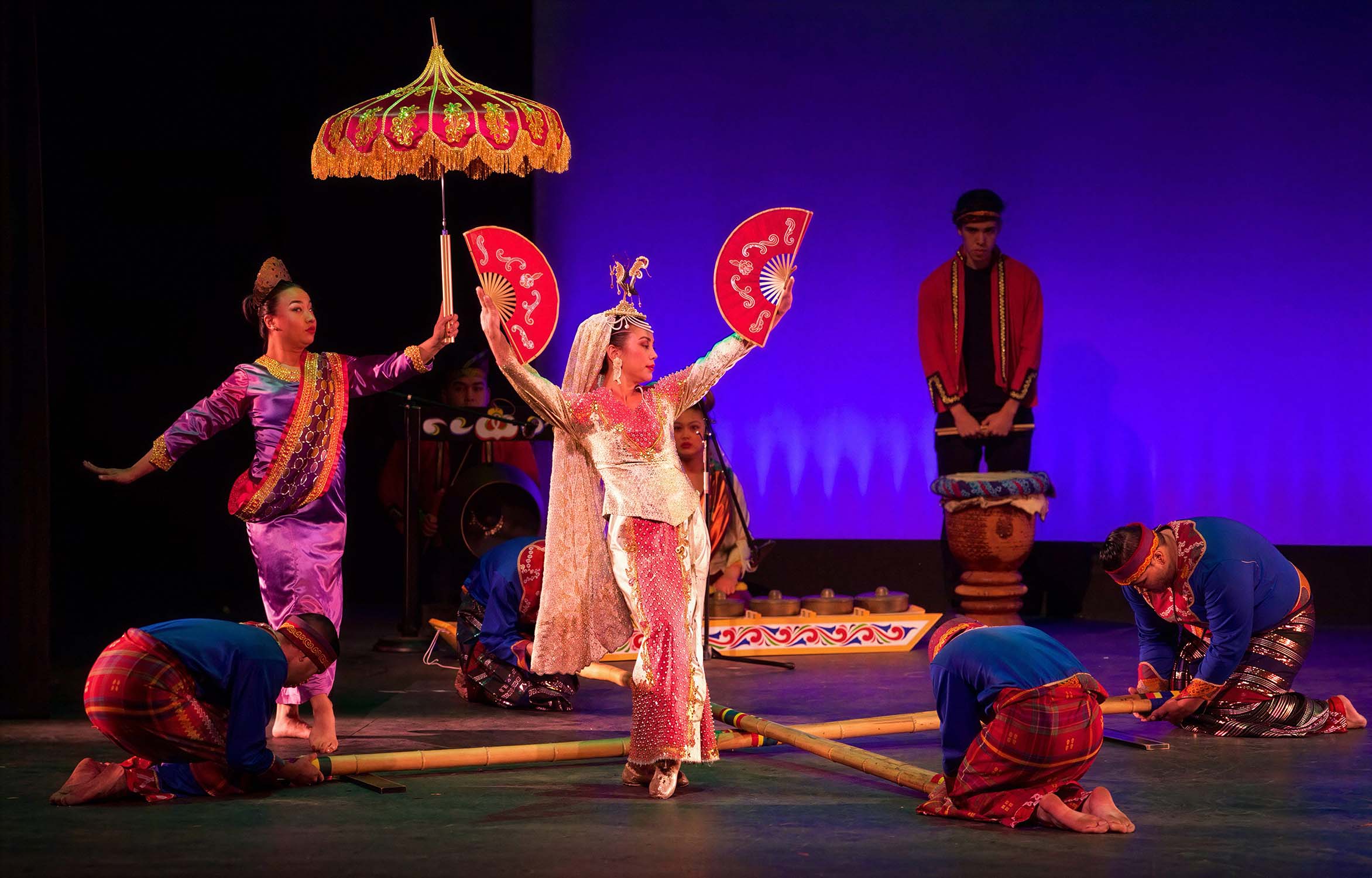 A princess weaves gracefully through crisscrossed bamboo poles clapped in syncopated rhythm, while a prince manipulates sword and shield. Based on an episode from the Darangen epic where Prince Bantugan rescues Princess Gandingan from enchanted spirits.